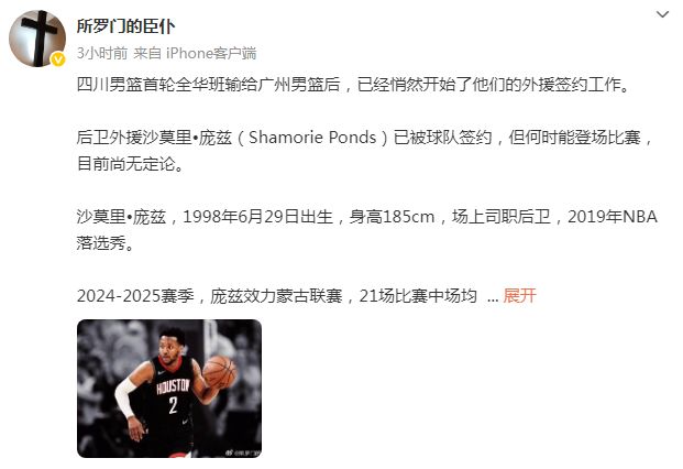 如今根据媒体人所罗门的臣仆报道:“四川男篮首轮全华班输给广州男篮后,已经悄然开始他们的外援签约工作。NBA落选秀后卫外援沙莫里-庞兹已被球队签约,但何时能登场比赛,目前尚无定论。” 庞兹是一位27岁的后卫,身高185cm,是2019年NBA落选秀。2024-2025赛季,庞兹效力蒙古联赛,21场比赛场均得到22.9分6.1篮板4.3助攻3.3抢断,2分命中率58.9%,3分命中率31.6%,罚篮命中率89.6%。