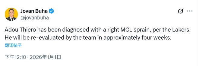 | 北京时间1月1日,湖人官方表示,新秀前锋阿杜-蒂耶罗被诊断为右膝内侧副韧带扭伤。他将在大约四周后接受队医的复查。这意味着蒂耶罗将至少缺席四周的比赛。目前,湖人的伤病名单上还有八村垒、文森特和里夫斯。