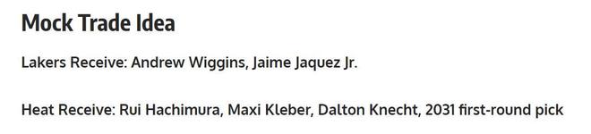 潜在交易方案如下 湖人得到:维金斯+小海梅; 热火得到:八村垒+克莱贝尔+克内克特+2031年首轮签。