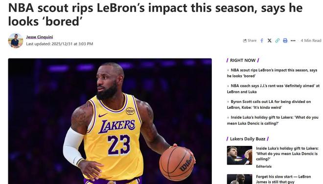 詹姆斯意外被嘲 在湖人队接连输球战绩下滑,同时暴露出明显防守短板的情况下,41岁的詹姆斯意外被嘲。 美媒RG.org邀请多位NBA业内人士谈论本赛季湖人队与詹姆斯的表现,其中匿名球探公开嘲讽詹姆斯。 詹姆斯本赛季看起来永远都是那么疲惫,他还能偶尔打出追身大帽、反击暴扣等表现,但那些只是集锦片段而已,他在禁区的终结效率下滑严重,对抗也大不如前,开始痴迷于三分投射。