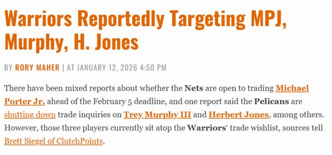 西格尔表示,若要交易得到墨菲,勇士可能会以库明加作为主要匹配薪资的筹码,并且球队愿意送出两个首轮签。不过他并未透露针对琼斯的潜在报价细节。 对于小迈克尔-波特,西格尔指出,早期迹象显示勇士不愿为他付出超过一个首轮签,因为这笔交易可能需要同时送出库明加和穆迪。勇士管理层对23岁的穆迪的发展进度有些失望,因此球队“非常愿意”在截止日前送走他。