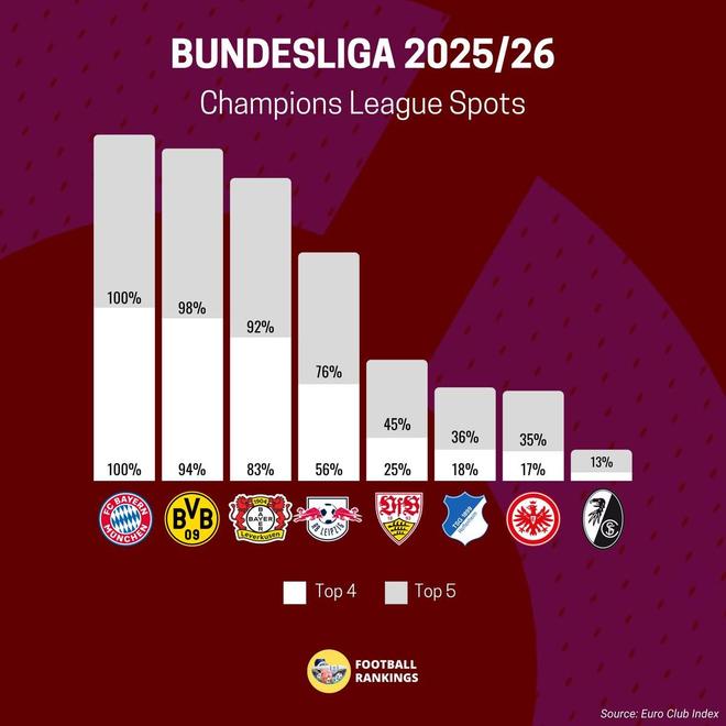 | 北京时间12月29日,Football Rankings预测了德甲本赛季前四名的概率,拜仁慕尼黑获得下赛季欧冠资格的概率为100%,多特蒙德94%第二,勒沃库森83%第三。