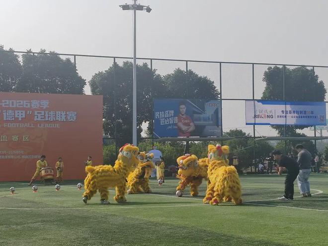 活动现场,来自勒流各行各业的足球爱好者分组进行绕杆、颠球、射门、传球配合等技术测试,角逐代表勒流出战“德甲”正赛的珍贵名额。选手们沉着应战、默契配合,展现出顺德草根足球的扎实功底与拼搏精神。最终,选拔出的29名优秀球员将与镇街推荐的11名球员共同组成勒流战队,在接下来的联赛中为家乡荣誉而战。 除了紧张激烈的选拔环节,现场更有富有趣味性的体验活动,吉祥物“大湾鸡”化身守门员,与观众互动射门游戏,引来阵阵欢笑。完成射门挑战的观众,还有机会赢取小礼品。 以“醒狮+足球”创意,富裕青少年醒狮队震撼开场,雄狮随着铿锵鼓点腾挪跳跃,时而威武昂首,时而灵动戏球,仿佛将足球场化为传统文化展演的舞台,勒流非遗民俗的活力,正与当代体育的精神同频共振。紧接着,稔海小学足球小将们登场表演,将足球与体操、舞蹈相结合,展现着勒流足球未来的勃勃生机。这场“醒狮迎战,少年接棒”的串联演出,生动诠释了勒流文化在传承中创新、在运动中融合的城市气质。