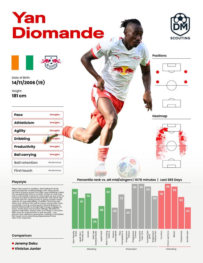 西纳约科是一名全能型前锋,不仅能打中锋,还可以胜任左右两翼。但他的进球效率不高,159次为欧塞尔出场,只打入25球,另有23次助攻。本赛季,西纳约科代表欧塞尔参加了16场法甲联赛,共打入6球并送出2次助攻。根据德国「转会市场网」的数据,他目前的转会身价约为700万欧元。 目前没有更可靠的消息来源报道过曼联与西纳约科之间的任何关联,因此对于这一传闻,可以当做《故事会》观看,很可能是经纪人的「抬价」手段。曼联最近确实与另一名前锋有传闻,这得到了罗马诺的确认,莱比锡红牛的亚恩·迪奥曼德(Yan Diomande)是红魔和热刺派出球探考察的目标。 「我听说有几家英超俱乐部都在关注这孩子。」罗马诺说道,「他目前在莱比锡红牛表现非常出色,同时他还代表科特迪瓦参加了非洲国家杯比赛。这是一名极具天赋的边锋,既擅长盘带,速度也很快。所以他是一名非常出色的球员,拥有巨大的潜力,真是非常有趣的天才。所以我要告诉你们,不只是曼联和热刺关注他,但两队持续考察他的情况。」 德国天空体育的弗洛里安·普莱滕贝格称,莱比锡红牛为迪奥曼德要价超过8700万英镑。但必须强调的是,19岁的左边锋迪奥曼德,只是一名被认为具有潜力的未来型球员,而不是马上就能决定比赛胜负的成熟球员。本赛季他在14场德甲打入6球,并有3次助攻。 「竞技网」的权威转会专家大卫·奥恩斯坦表示,在被塞门约拒绝后,曼联不大可能在冬窗寻求引进其他前锋,但未来的转会窗可能再次考虑该位置。