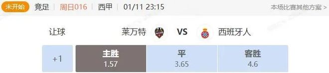 2.专家:高飞 竞足 周日016 西甲 莱万特VS西班牙人 开赛时间:2026-01-11 23:15:00