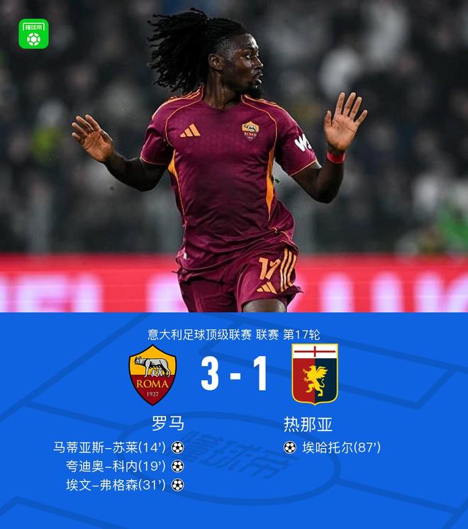 北京时间12月30日,意大利足球顶级联赛第17轮,罗马坐镇主场迎战热那亚。比赛中,马蒂亚斯-苏莱率先打破僵局,为罗马取得领先。随后埃文-弗格森送出助攻,帮助夸迪奥-科内破门扩大比分。不久之后,埃文-弗格森接应进攻再度建功,将优势进一步巩固。直至比赛末段,热那亚由埃哈托尔攻入一球,挽回些许颜面。最终全场比赛结束,罗马以3比1战胜热那亚。