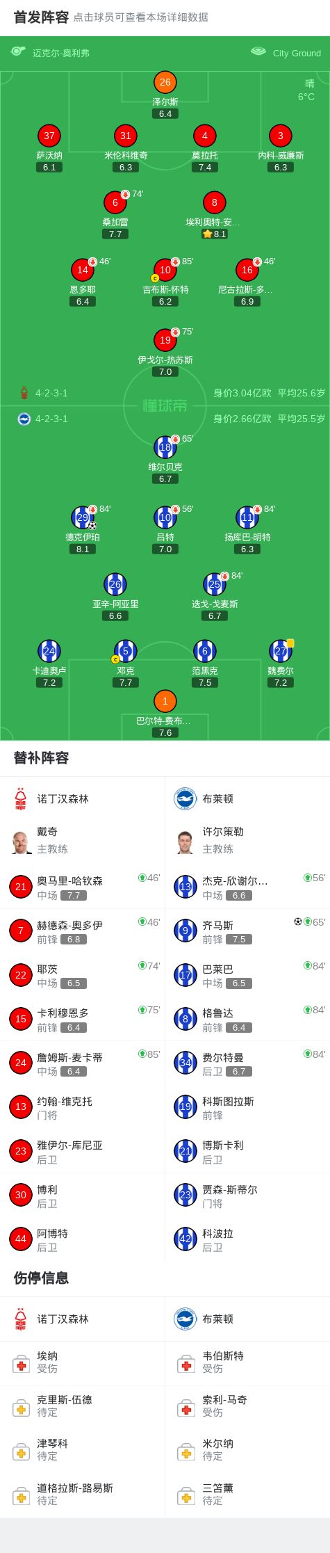 第45+1分钟,德克伊珀低射破门,布莱顿1-0森林