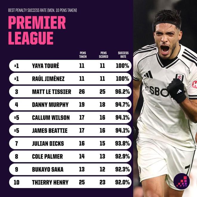 这是希门尼斯在英超联赛中第11次主罚点球,他依然保持着11罚11中的惊人纪录。 这一数据让他正式追平了曼城传奇球星亚亚-图雷,两人目前并列成为英超历史上保持100%命中率的前提下,点球进球数最多的球员。