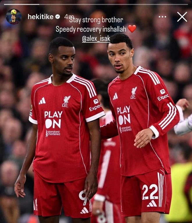 | 在利物浦前锋伊萨克受伤后,他的队友埃基蒂克在社交媒体上发文祝他早日康复。
