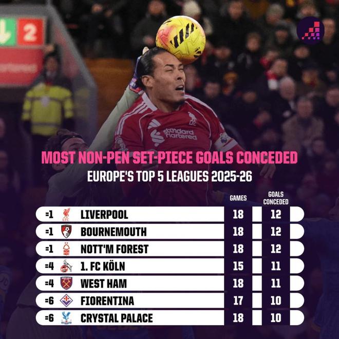 | 数据网站OPTA统计,在2025-26赛季欧洲五大联赛中,利物浦、伯恩茅斯与诺丁汉森林三支球队并列成为非点球定位球失球最多的球队,均为18场比赛失球12个。