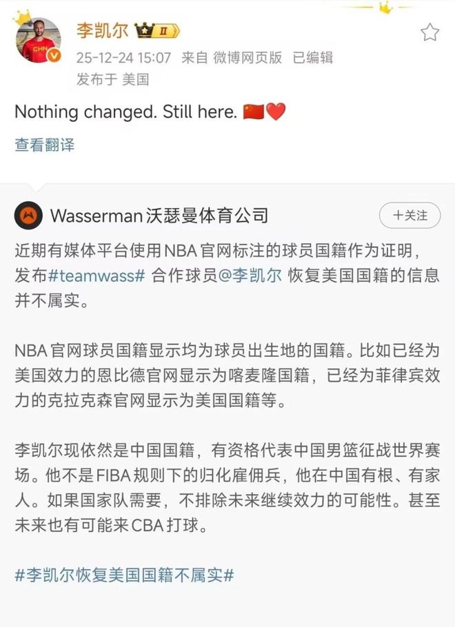 李凯尔及其经纪公司沃瑟曼体育公司于2025年12月24日发布声明:否认李凯尔恢复美国国籍的传闻。 李凯尔经纪人公司在声明中解释:NBA官网标注国籍的规则是显示球员出生地国籍(如效力美国队的恩比德标注喀麦隆、效力菲律宾的克拉克森标注美国),与实际效力的国家队无关。 李凯尔也转发声明并配文“中国国旗表情”,暗指自己身份未变。 当然,国际篮联(FIBA)官网也显示李凯尔的国籍标注为“CHN/USA”,佐证李凯尔具备代表中国男篮的资格。 谣言和质疑,可以停止了! 其实,李凯尔的国籍还存在一个问题,就是中国法律不承认双重国籍,但FIBA允许归化球员保留原国籍参赛。 因此,李凯尔是否已放弃美国籍,就无从知晓了。