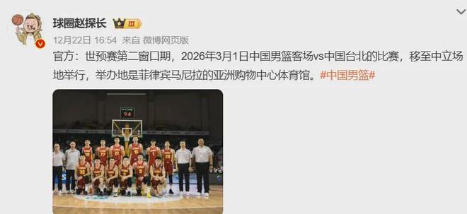 值得一提的是,明年3月1日中国男篮VS中国台北队的比赛,将移至中立场地举办,地点位于菲律宾马尼拉的亚洲购物中心体育馆。 至于为什么?FIBA官方尚未给出解释,但懂的都懂,现在的体育运动早已不纯粹,掺杂了太多不可控因素,只能尽量避免。