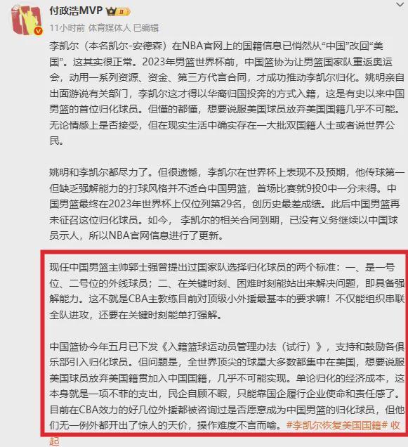 | 辟谣了。 李凯尔目前仍是中国国籍,意味着未来依然有资格代表中国男篮出战FIBA比赛。