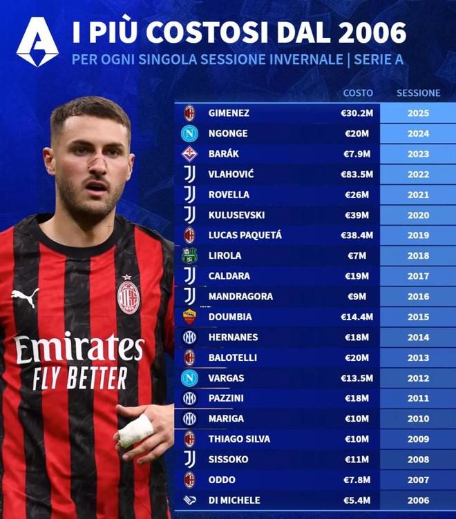 | 北京时间1月13日,德转列出了2006年至2025年意甲俱乐部历年冬窗引援的标王,尤文图斯2022年1月8350万欧元从佛罗伦萨引进弗拉霍维奇高居第一。