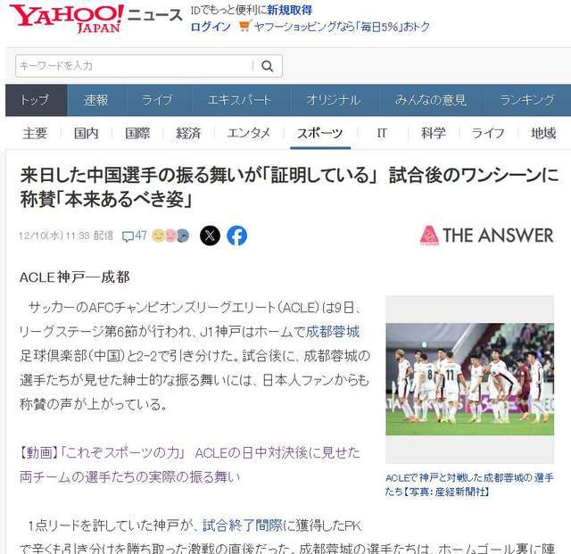 整场比赛客场作战的成都蓉城并不落下风,如果不是最后时刻的争议点球,差点就带走3分。不过,在收获一场平局后,日本主场球迷还是为远道而来的成都蓉城送上了掌声,日本媒体和转播方都对此进行了报道,并大赞成都蓉城赢得了日本球迷的称赞和尊敬。